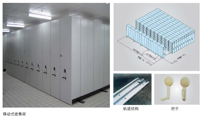 密集架充分利用空間,空間利用率比普通貨架提高了三倍,地面的滑軌穩(wěn)定流暢,并有多種安裝方式。移動(dòng)方式采用搖柄或拖拉把手,特殊應(yīng)用可以選擇電動(dòng)。