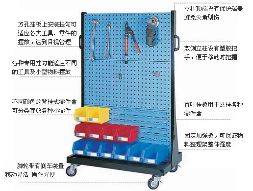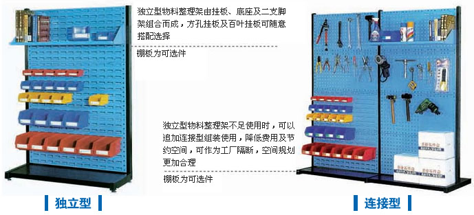 百葉掛板可以與背掛零件盒配合使用,運用靈活、節(jié)省空間、一目了然,是低費用的工業(yè)裝備。 |